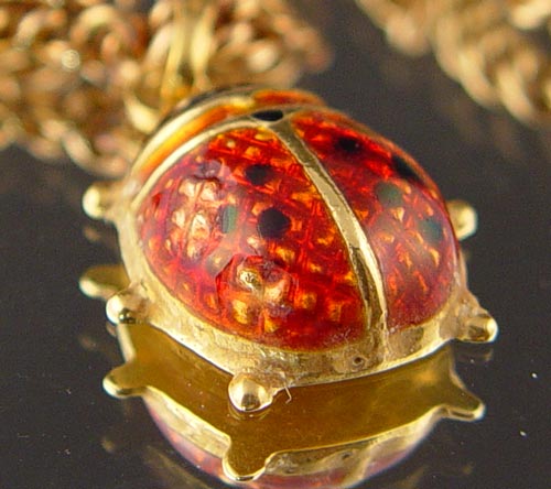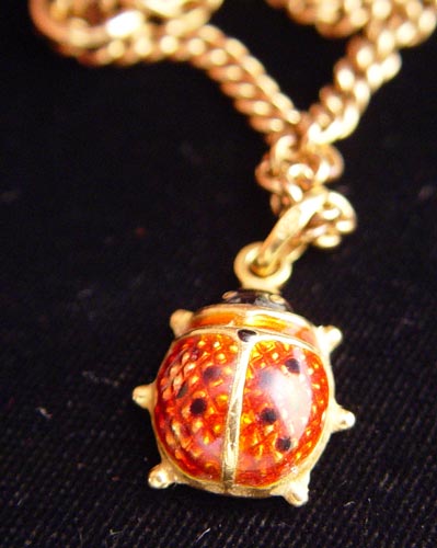 14K CURB LINK CHAIN WITH 18K ENAMELED LADYBUG CHARM: 14K yellow gold 14'' curb link chain, 16.5 grams. Hanging from it is an 18K yellow gold enameled ladybug charm. 1.8 grams. 18.3 grams total.