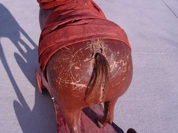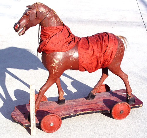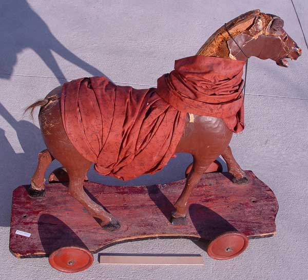 CHILD LEATHER RIDE ON PULL HORSE: On board with wheels. Original paint. Measures 29 1/2'' high x 32 1/2'' wide x 12'' deep. Please note loss of leather.