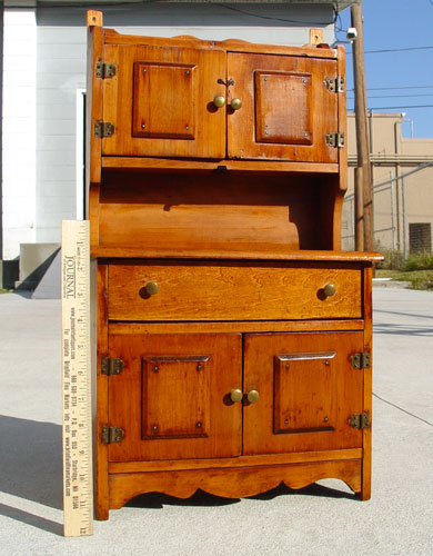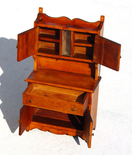 CHILD'S DIMINUTIVE COUNTRY STEPBACK CUPBOARD: Has everything the full size version would have including doors & drawers. Can be hung on wall. Measures 22 1/2'' high x 12 3/4'' wide x 6 1/2'' deep