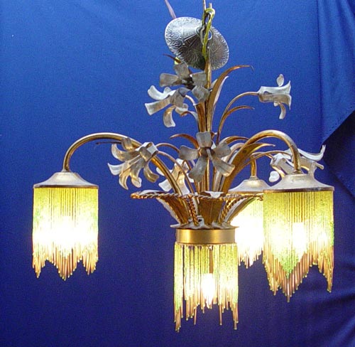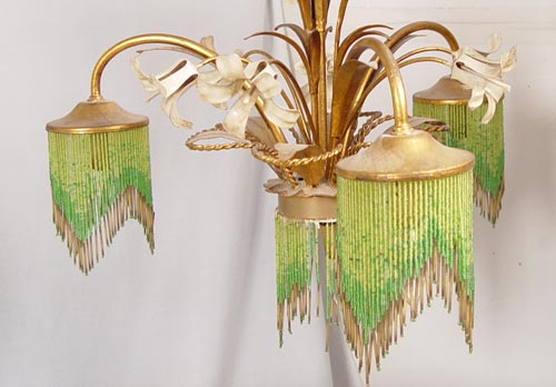 VINTAGE ITALIAN ART METAL CHANDELIER GLASS BEAD SHADE: Metal floral design with glass bead strand shades. Marked with metal tag Made in Italy. Measures 21'' high x 20'' wide. Please note several missing strands.