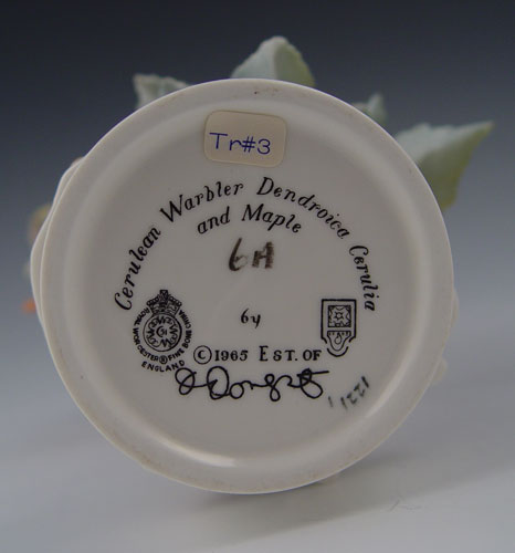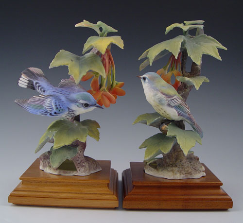 DOROTHY DOUGHTY FOR ROYAL WORCESTER CERULEAN WARBLERS, MALE AND FEMALE: Models titled ''Cerulean Warbler and Maple''. Dated 1965. Approx. 9 1/2'' tall overall including the 5'' square wooden base.
