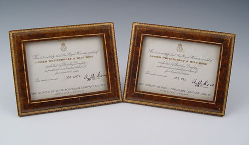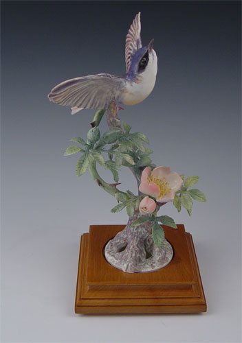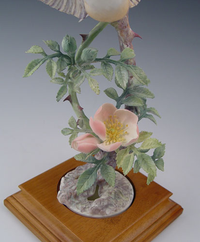 DOROTHY DOUGHTY FOR ROYAL WORCESTER LESSER WHITETHROAT: Model titled ''Lesser Whitethroat Sylvia Curruca and Wild Rose''. Dated 1964. Approx. 10 1/4'' tall overall including the 5'' square wooden base.