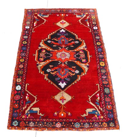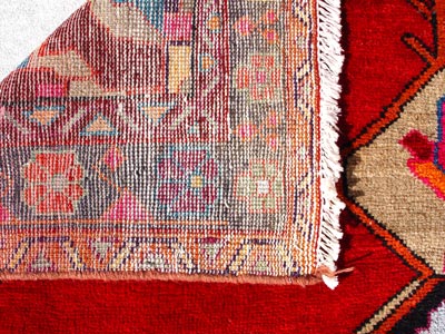 HAND TIED CARPET: Approx. 9' 5'' x 4'3'', bright colors as is the fashion in late 20th C carpets.