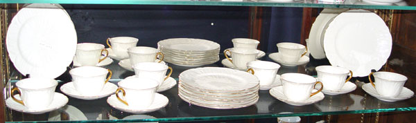 25 PIECES SHELLEY WHITE ''OLEANDER'' FINE CHINA: Gold rim Oleander to include 9 plates (9'' dia.), 8 cups and 8 saucers.