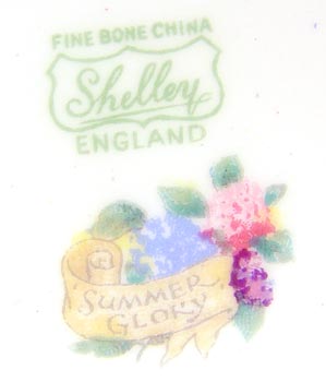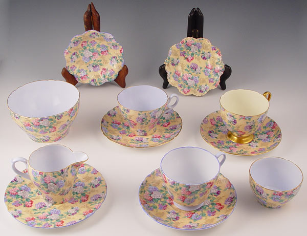 11 PIECES SHELLEY ''SUMMER GLORY'' FINE CHINA: Yellow ground. 11 pieces to include 2 round nut dishes, 1 cream pitcher (2 3/4''), open bowl (5'' dia), 3 cups, 3 saucers.