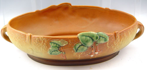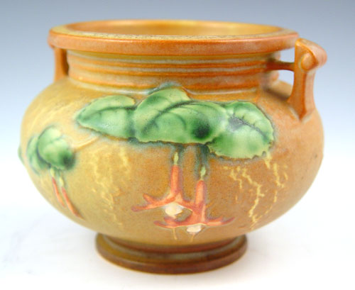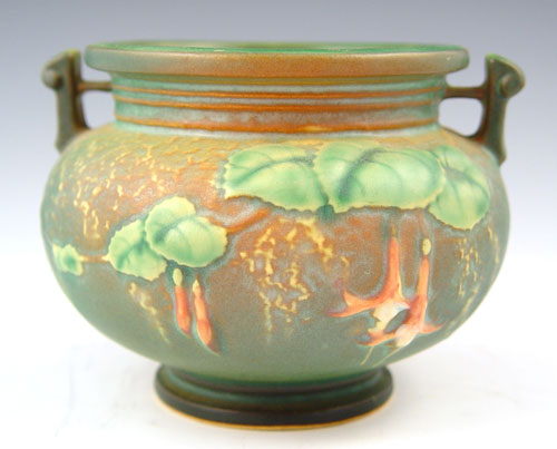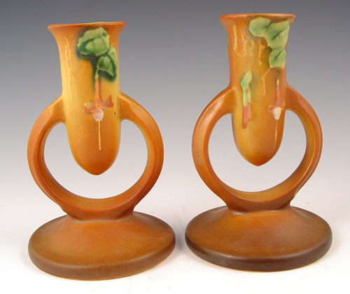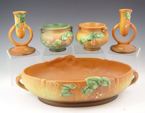 5 PIECE FUSCHIA ROSEVILLE POTTERY LOT: 1) Brown 645-3'' 2) Small green vase 645-3'' 3 & 4) Pair candlesticks 6'' 5) Planter, 352-12''.