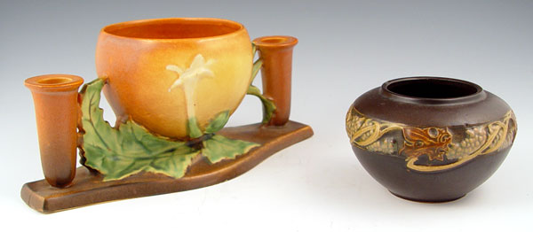 2 PIECE ROSEVILLE POTTERY LOT: 1) Thornapple double candle holder with bowl. 4 1/2'' X 5''. 2) Rosecraft ''Vintage'' bowl, 3 1/4'' tall.