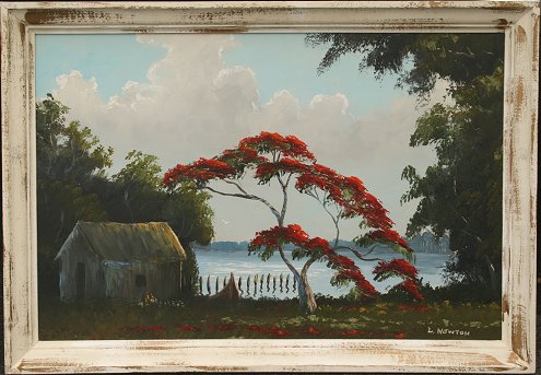 NEWTON, Lemuel, (American, 20th C.): Florida Highwaymen Landscape, Oil/B, 24'' x 36'', signed, framed, 26'' x 36''.