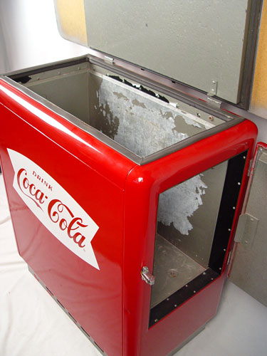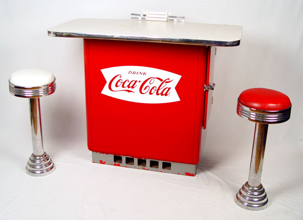 VINTAGE COCA COLA COOLER BAR WITH 2 STOOLS: Vintage Coca Cola cooler converted into a bar with Formica top. Cooler has been refurbished. Measures 39 1/2'' high x 47'' wide x 23 1/4'' deep. Red and white covered chrome stools measures 28'' high x 12'' dia at top. Please note chip in Formica on top.