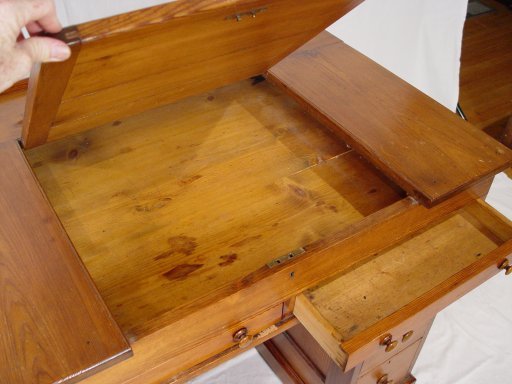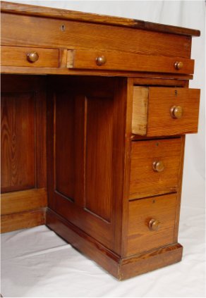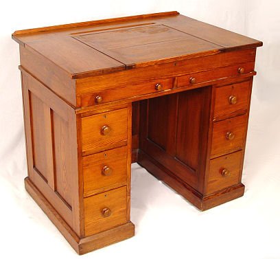COUNTRY PINE LIFT TOP DOUBLE PEDESTAL DESK: Pedestal with drawers, drawers under the lift top surface, paneled sides. 33 1/2'' x 26 1/2'' x 38 1/2''.