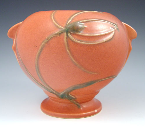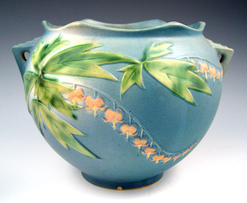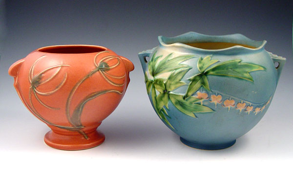 2 ROSEVILLE POTTERY JARDINIERES: 1) Blue Bleeding Heart 651-6'' 2) Pink jardiniere 343-6''