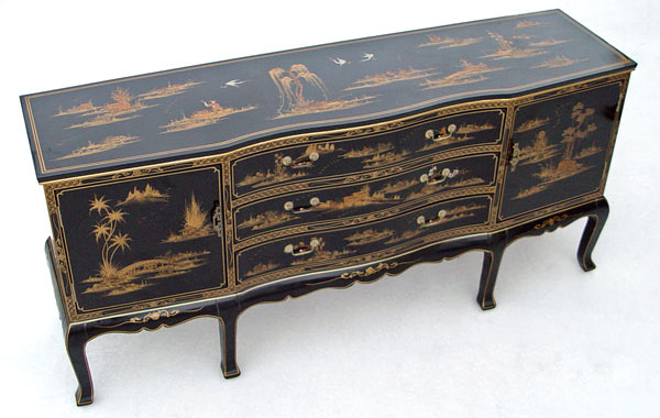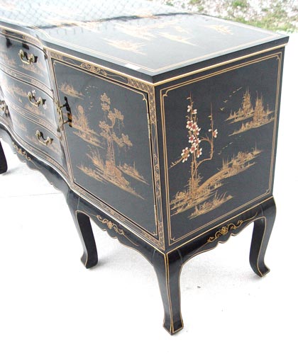 CHINESE GOLD DECORATED BLACK LACQUER SIDEBOARD / DRESSER: Serpentine front, three center drawers, side doors. 33 1/2''h. x 6' long x 19''.
