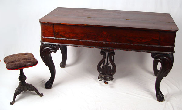 WHITNEY MELODIAN WITH CAST IRON STOOL: No reeds. Comes with cast iron stool. Case would make a great spinet desk. Melodian measures 32 3/4'' high x 55 1/4'' wide x 26 3/4'' deep. Stool measures 18 1/2'' x 14 1/2''.