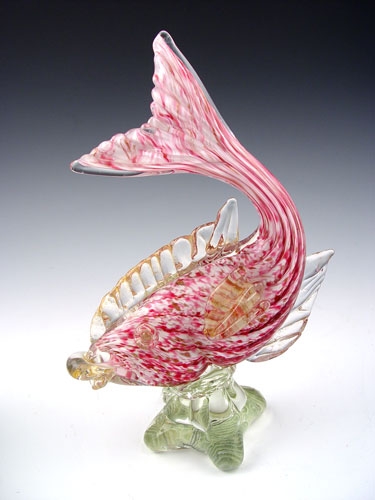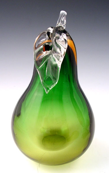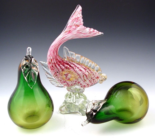 3 PIECE MURANO ART GLASS FISH & PEARS: To include 2 pears, green glass with clear glass leaf and stem. Remnants of paper tag on one. Measure 8 1/2'' high. 1 fish sommerso with pink and white interior, aventurine. Measures 12 1/4'' high.