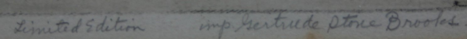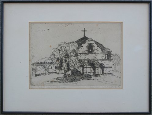 BROOKS, Gertrude Stone, (American, 19/20th C.): Mission San Antonio de Padua, Etching, 7'' x 10'' sight size, pencil signed, titled and dated 1938, framed, 12'' x 16 1/4''. Several spots of foxing, not examined out of the frame.