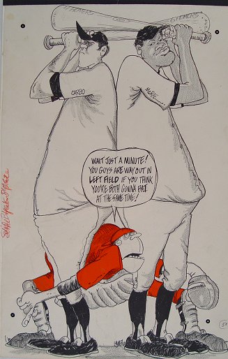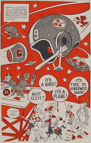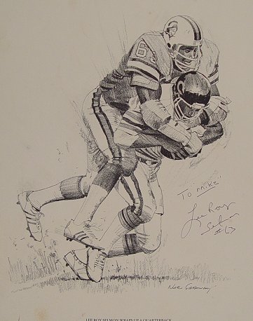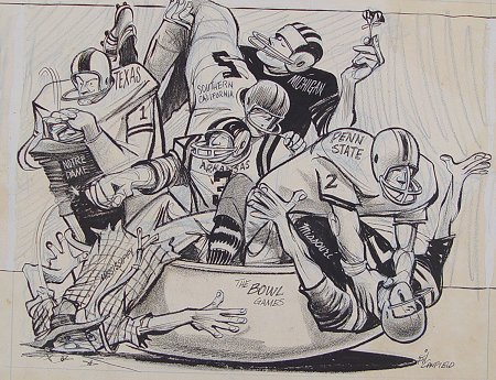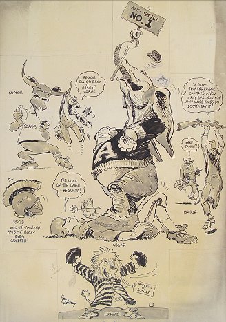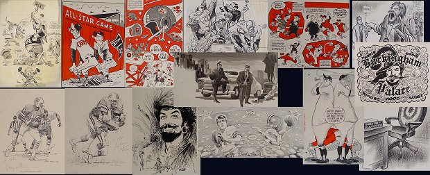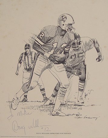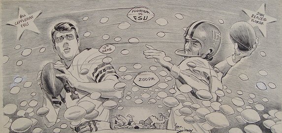14 PIECE NEWSPAPER ILLUSTRATION ARTWORKS: To include several Lamar Sparkman works (he designed the original Tampa Bay Buccaneers logo), one of which depicts FSU quarterback Bill Cappelman and Florida Gators quarterback John Reaves facing off in the teams 12th meeting, (Cappelman at one time held most of FSU's passing records, and is a former grad of Dunedin High, Reaves at one time held the NCAA record for passing yards in a season), other artists include George Stewart, Canfield, Reichhold, Bill Winstein, and 2 autographed lithos of Doug Williams and Lee Roy Selmon by Nixon Galloway. Sold as a lot, as is, unframed.