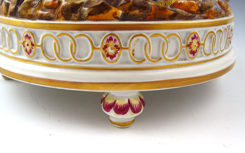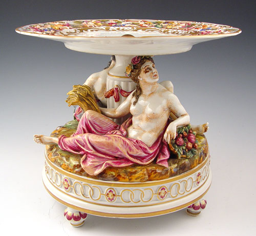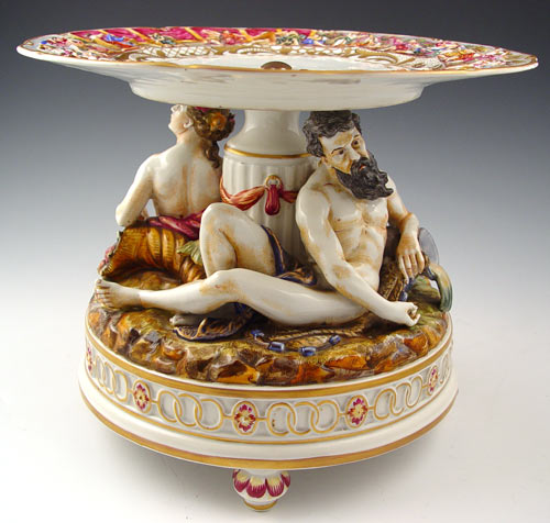 ORNATE FIGURAL CAPO-DI-MONTE COMPOTE: Two detailed figures support a plate with molded figural border, gold crown N mark, 9'' tall, 11'' dia.