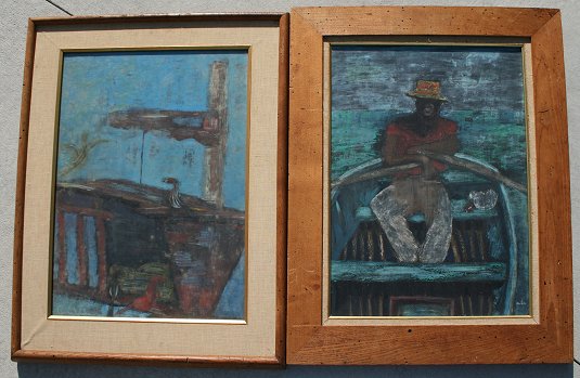 WICKS, Ann, (American, 20th C.): Pair Pastels, Man in a Rowboat & Dock Scene, 24'' x 18'', signed, matching barnwood frames, 31'' x 25''.