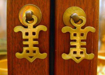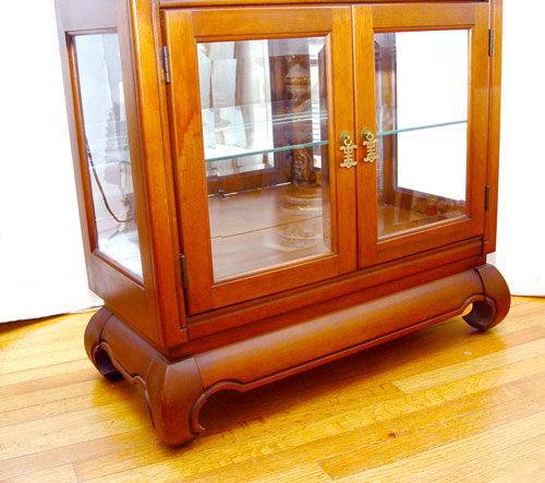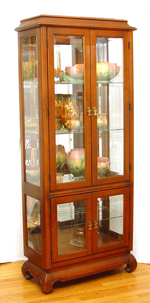 CHINESE CHIPPENDALE STYLE CURIO DISPLAY CABINET BY BROYHILL: Illuminated mahogany cabinet, glass sides & front, 4 door mirrored back, glass shelves with plate grooves. Measures 76'' high x 31'' wide x 15'' deep overall.