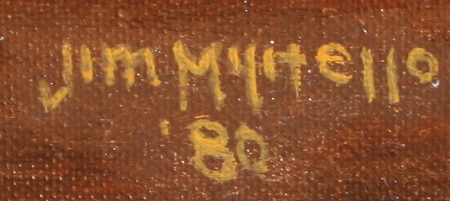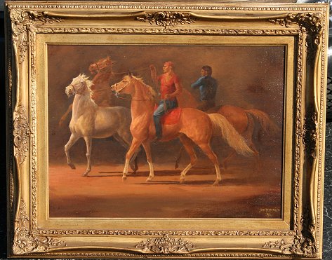 MILITELLO, Jim, (American, 20th C.): Horse Trainers, Oil/CB, 20'' x 24'', signed and dated '80, overpainted gilt frame with some missing color. Several touches of inpaint.
