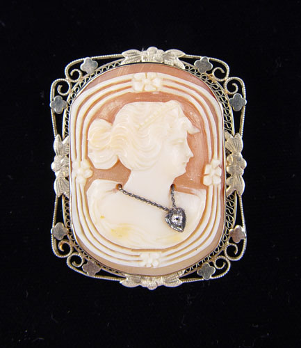 14K EDWARDIAN CAMEO BROOCH/PENDANT WITH DIAMOND: 14K white gold framed rectangle shaped cameo brooch/pendant. Shell cameo depicts a female bust in profile wearing one round single cut diamond. The diamond is approx. .025 CT., rated VS in clarity and H in color. Filigree frame with bar pin closure and pivot bail. Approx. 1.5'' x 1.25'' Weight: 9.8 grams.