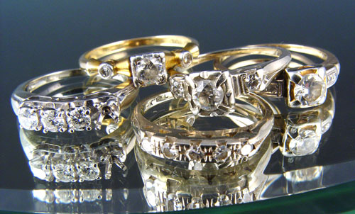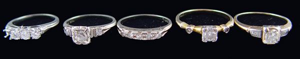 LOT OF FIVE 14K & DIAMOND RINGS: Lot of five 14K yellow and white gold diamond engagement rings and wedding band. One ring contains some 18K and one ring contains a platinum head. Total of 19 round brilliant cut, old European round cut and round single cut diamonds. Total diamond weight: 1.30 Ct. Approx. The diamonds range from VS1 to SI2 in clarity and G-J in color. Weight: 11.8 grams.