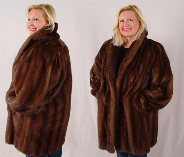 BROWN MINK JACKET: Car coat length, large size. Florida Fur St. Petersburg Fl label. The jacket has a full collar and long roomy sleeves. 34'' long, 22'' sleeve, 21'' shoulder to shoulder.