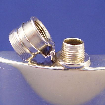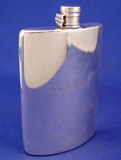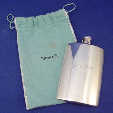 TIFFANY & COMPANY STERLING SILVER FLASK: Tiffany & Co. Makers, 5'' x 3 1/4''. Monogrammed ''Jack Heftel''. Approx. 203 grams or 6.6 0z. Sold with the blue Tiffany bag.