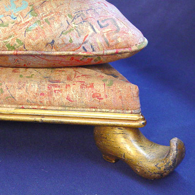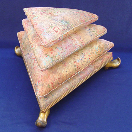 DUTCH GOLD GILT TRI-TIERED FOOT STOOL: Three triangular cushions stacked into a stool, gilt metal feet. 16'' high X 23'' dia.
