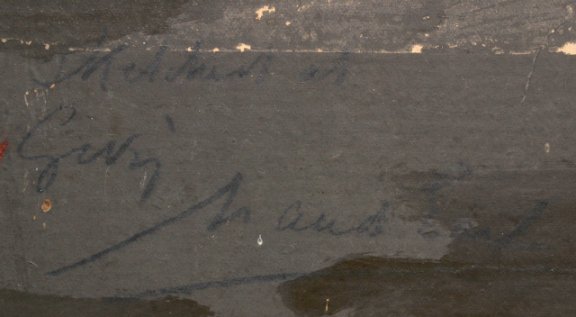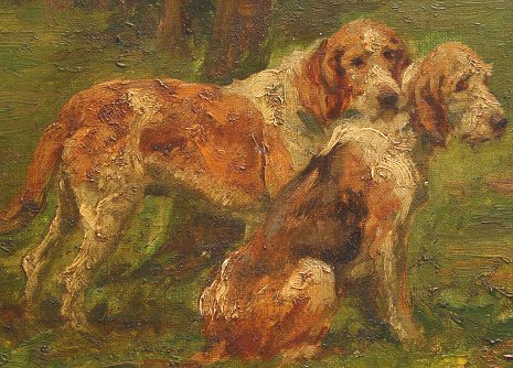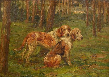 EARL, Maud, (Amer./Eng.,1864-1943): Pair of Fox Hounds, O/CB, 10'' x 14'', signed verso, pencil inscription reads, ''Sketched in Givry, Griffon, ****, belonging to le Baron Jaubert'', presumably the Baron's dogs names; Earl was widely known for painting important persons pets/animals. Est. $3000/5000**