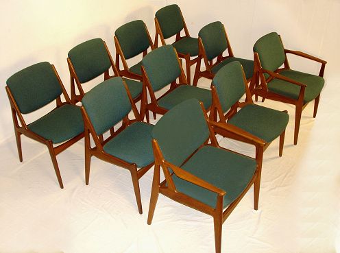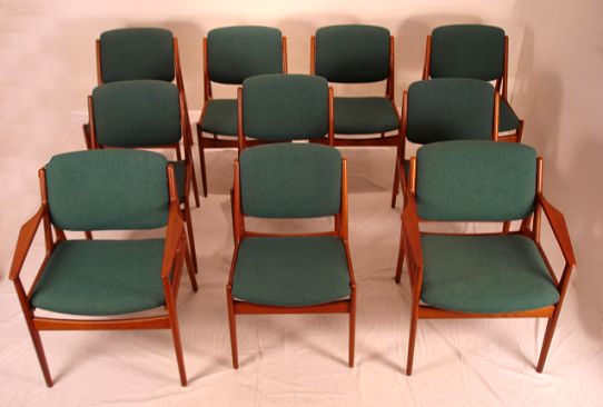 SET OF 10 ARNE VODDER TEAK PIVOT BACK DINING CHAIRS: Eames Era, original upholstery. 32'' high X 21-23'' wide.