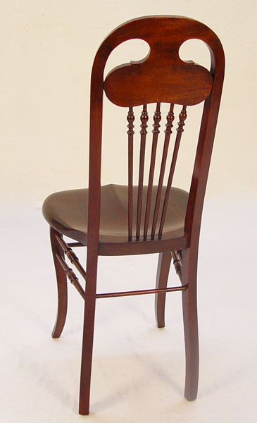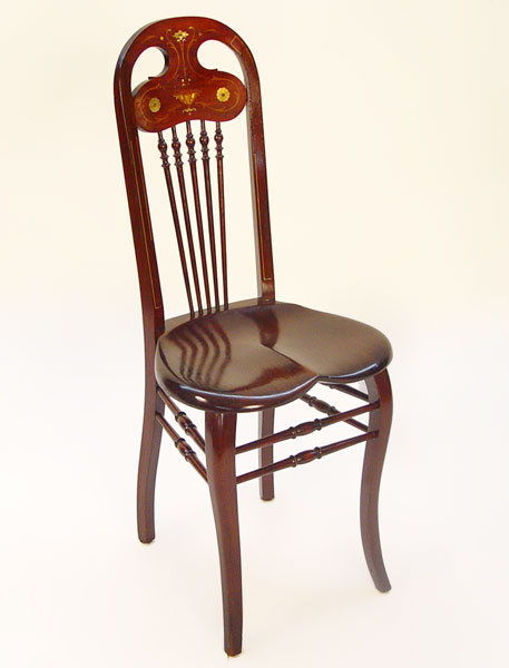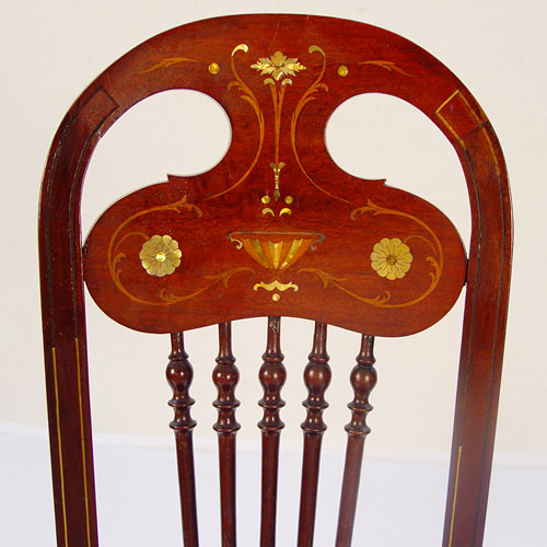 MOTHER OF PEARL INLAY ART NOUVEAU SIDE CHAIR: Narrow chair with heart shaped seat. Mother of pearl and string inlay back over 5 turned splats. Please note loss of some string inlay. 38 1/2'' high X 16'' wide X 14'' deep