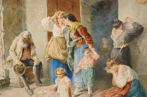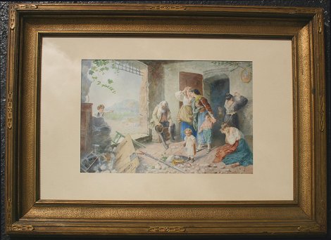 'THE TRAGEDY'', 19TH C. ITALIAN W/C SIGNED RICCARDI: 13 1/2'' x 21 1/2'' sight size, signed, gilded Newcomb-Macklin quality frame, 24'' x 36''. Est. $1000/2000**
