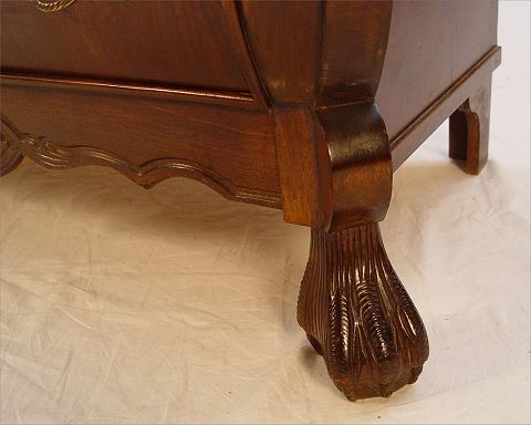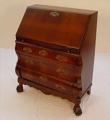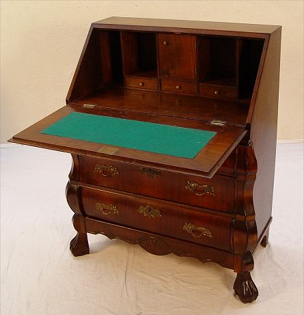 MAHOGANY BOMBAY DROP FRONT DESK: Interior with pigeon holes, drawers and felt writing surface. Shaped and canted corners ending in claw feet. 39 3/4'' high X 35'' wide X 18'' deep.