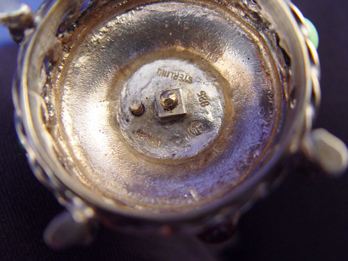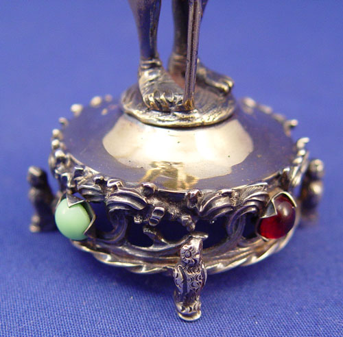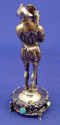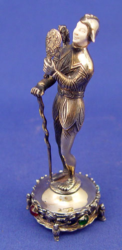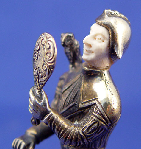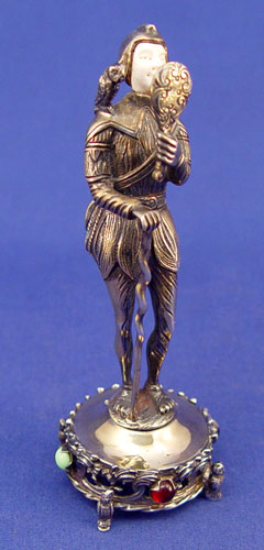 GEM SET STERLING AND IVORY FIGURE OF TYL EULENSPIEGEL: The legendary prankster, shown with the mirror and owl, for which he is most famous. 5''h., Marked 925 sterling, Germany.