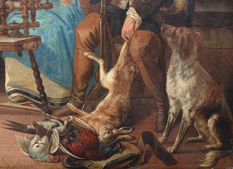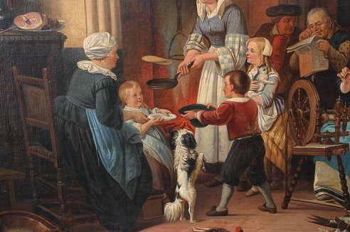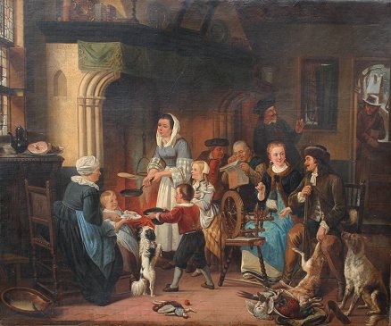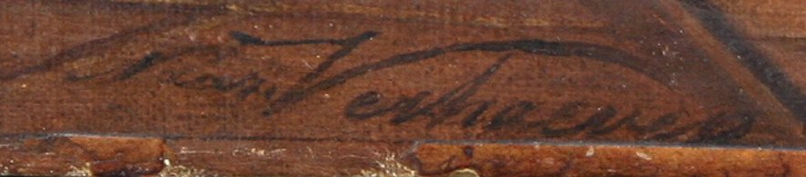 19TH C. DUTCH INTERIOR GENRE SCENE: Oil/C, 29 1/2'' x 35 1/2'', signed illegibly Verhaerens?, gold frame, 33'' x 40''. Relined, scattered inpaint.