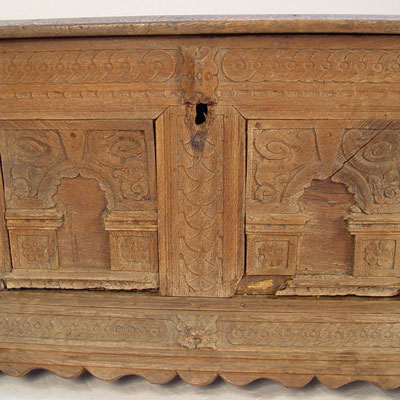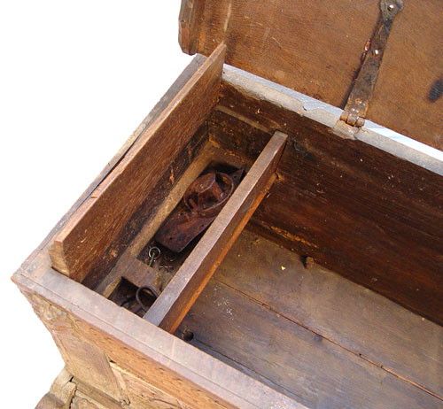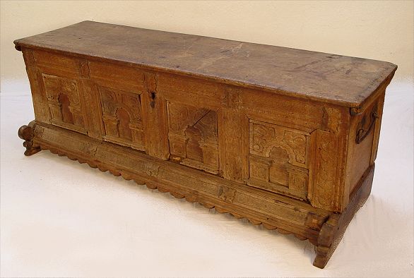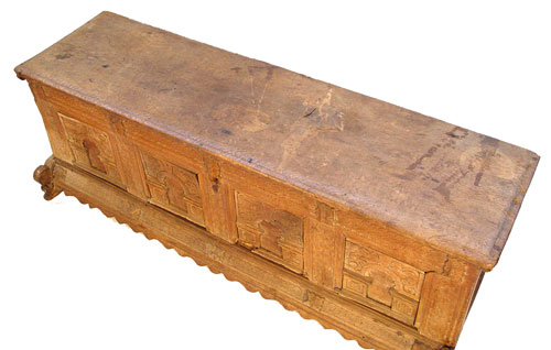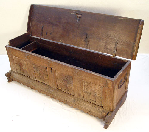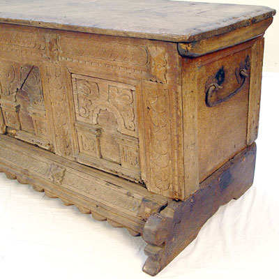 18th C ITALIAN TRUNK: Hand wrought hardware, relief carved quarter sawn oak panels, 24 3/4''h. x 70 1/2''w. x 23''d.
