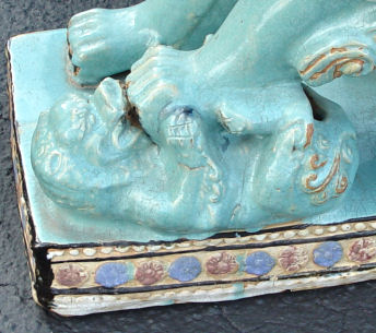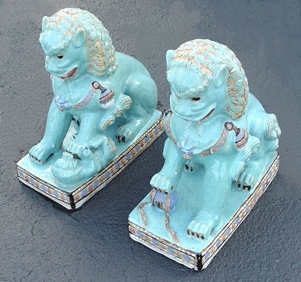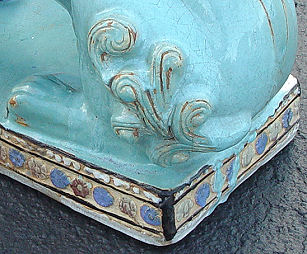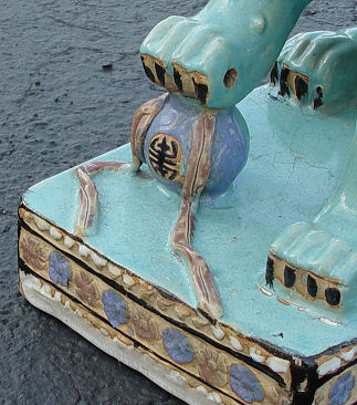 PAIR OF CHINESE GLAZED EARTHENWARE KYLINS: Large palace guard type dog figures, 21''h., the plinths are 19'' x 10''. Age unknown.