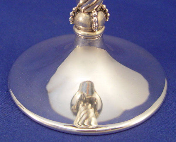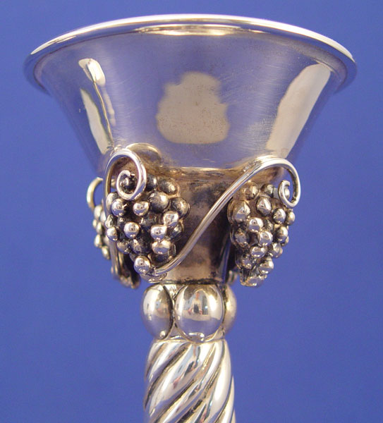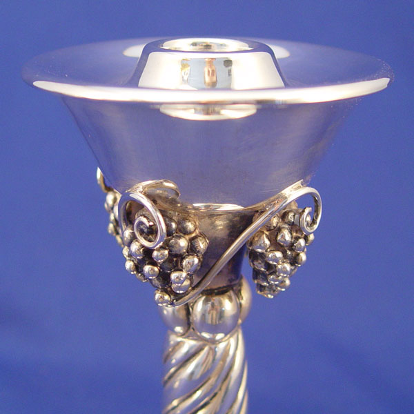 PAIR OF CODAN MEXICAN STERLING CANDLESTICKS: Codan's very Jensen Danish style candle holders with a twisted column and bunches of grapes dripping from the bobeches. 6 3/4''h., the bases are 4'' dia. Approx. 34.5 oz.