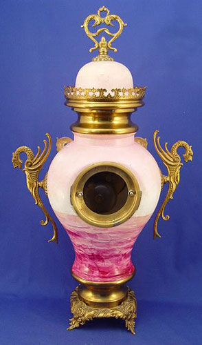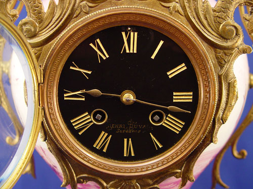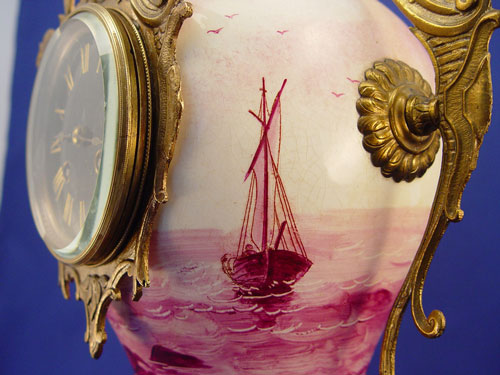 SURESNES FRENCH PORCELAIN CASE CLOCK: Hand painted in a monochromatic harbor scene with tall ships, metal mounts in the form of dragons. Black enamel dial with Roman numerals and beveled crystal. The dial is signed Henri Duval Suresnes. Brass works, time strike, key wind with key and pendulum included. 23''h. x 13'' dia. overall. The dial is 3 1/2'' dia. Recently cleaned and oiled.