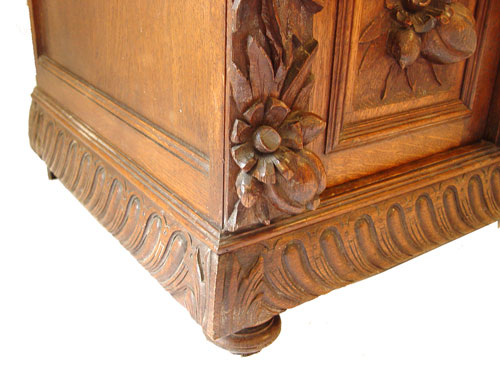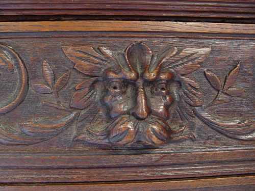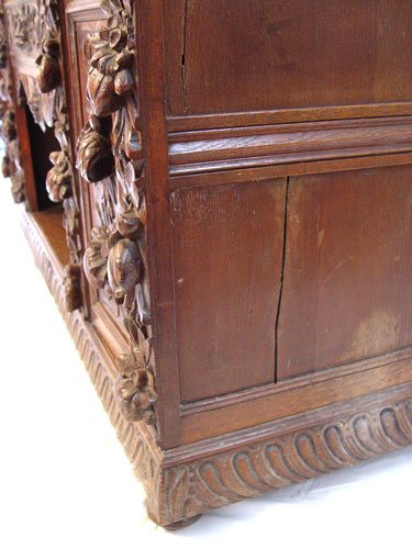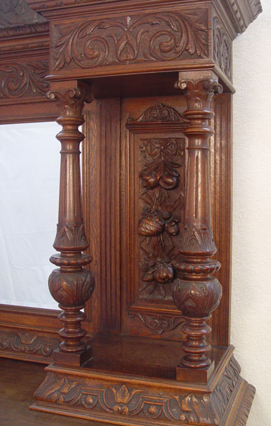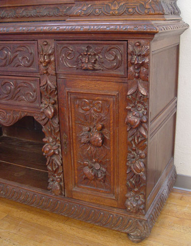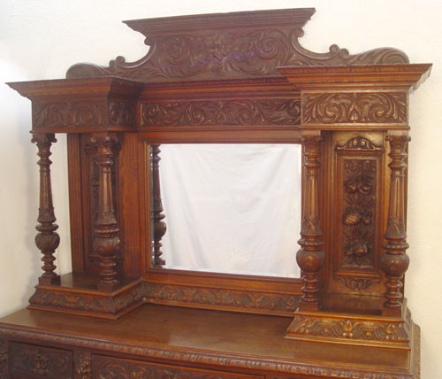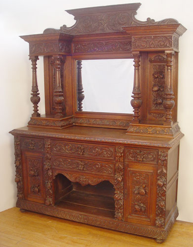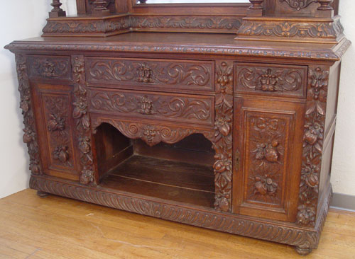 19th C ELABORATELY CARVED OAK SIDEBOARD CABINET: Three part cabinet with upper crest, center bevel mirror section and lower cabinet. All over carvings. Storage in drawers, behind doors, and open display. 91 1/4''h. x 72''w x 24 1/4''d. Est. $2500/3500**