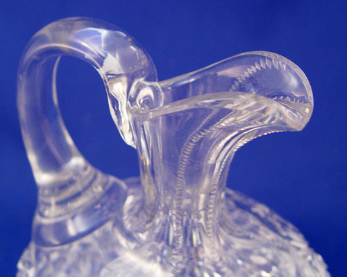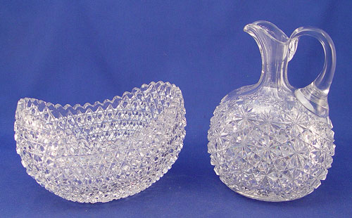 AMERICAN BRILLIANT CUT GLASS BOWL AND EWER: Hobnail cut bowl, 4 1/4''h. x 7 1/4'' long. The ewer is cut in a variation of the Russian pattern, 8''h.