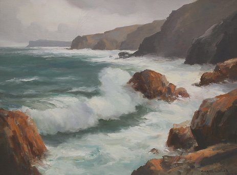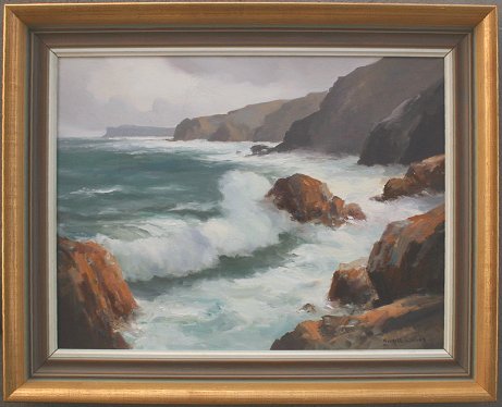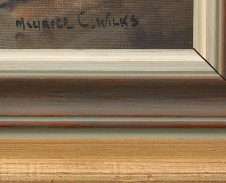 WILKS, Maurice Canning, (Irish, 1911-1984): ''Antrim Coast, Near Ballintoy, Co. Antrim'', Oil/C, 18'' x 24'', signed, titled verso, gilded frame, 23'' x 29 1/2''. The Wilks paintings were purchased by Mr & Mrs. Joseph Graden directly from Mr. Wilks when they lived in Northern Ireland. They were introduced to Mr. Wilks by a mutual friend and visited Mr. Wilks a number of times in his residence.