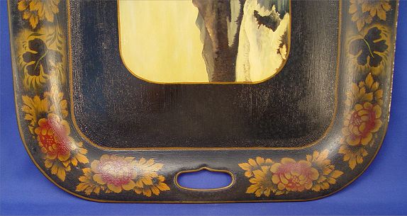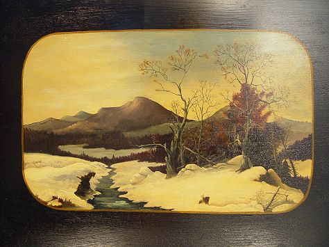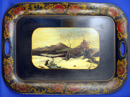 UNUSUAL PAINTED TOLE TRAY WITH WINTER SCENE: Painting artist signed, E.R. Testoni, dated 1954, 26 1/4'' x 19''.
