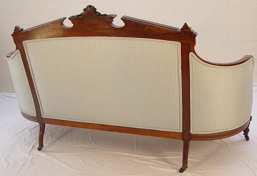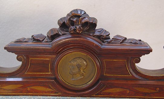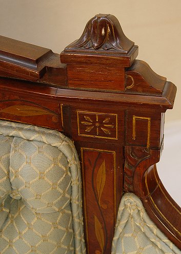 VICTORIAN RENAISSANCE CARVED AND MARQUETRY INLAID SETTEE: Pottier & Stymus quality. Metal medallion inset crest, frame with marquetry inlay and incised gold carving. Nicely detailed upholstery with shirred seat. 43''h x 75''w, Excellent condition but for small piece missing from right front leg.