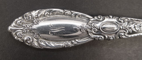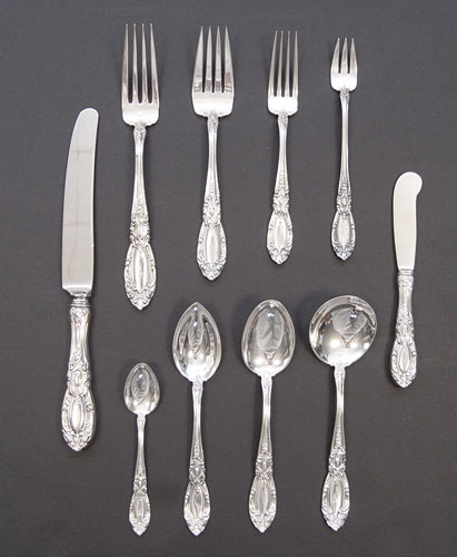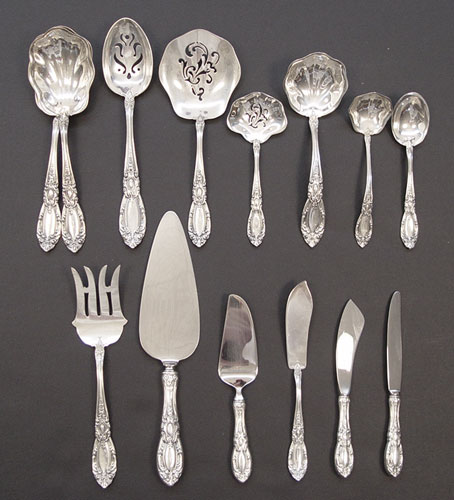 TOWLE ''KING RICHARD'' STERLING FLATWARE SERVICE: Very complete set of 140 pieces to include 12 dinner knives (8 7/8''), 12 dinner forks (7 1/4''), 24 salad or pastry forks, 12 orange spoons, 12 cream soup spoons, 24 teaspoons, 12 butter spreaders, 12 oyster or cocktail forks, a sugar shell, 5 youth forks, 1 youth knife, cold meat fork, gravy ladle, cream ladle, pastry server, cheese knife, fruit knife, master butter, 2 large casserole spoons (8 1/4''), slotted serving spoon (8 1/4''), tomato server (8''l), and a slotted bon-bon spoon. Most pieces are monogrammed ''W''. Approx. 251.43 troy oz.