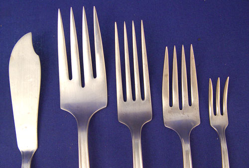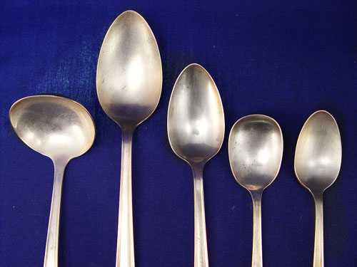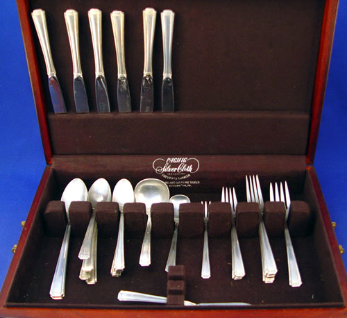 WESTMORELAND ''JOHN & PRISCILLA'' STERLING FLATWARE: 42 pieces to include 6 dinner knives (9''), 7 dinner forks (7 1/4''), 4 salad forks, 7 tablespoons, 11 teaspoons, 2 serving spoons, a meat fork, butter knife, cocktail fork, gravy ladle, and sugar shell. No monograms, sold with the wood storage box. Approx. 48 oz.