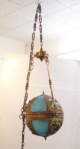 GLASS & BRASS ''BALL'' CHANDELIER NEW YORK: Custom made on Delancy Street in New York. Brass, blue glass and multi colored glass rock. 30'' overall length. Glass globe measures 16'' long X 12'' dia. Original 16' decorated brass swag chain and cord.