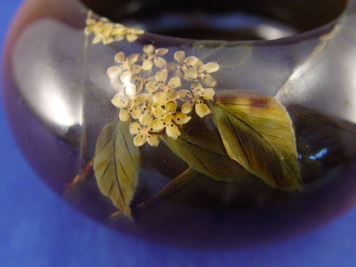 ROOKWOOD ART POTTERY DECORATED BY SALLY COYNE: Signed SEC, standard glaze with hand painted floral decoration. 2 1/2''h, 5'' dia. overall.