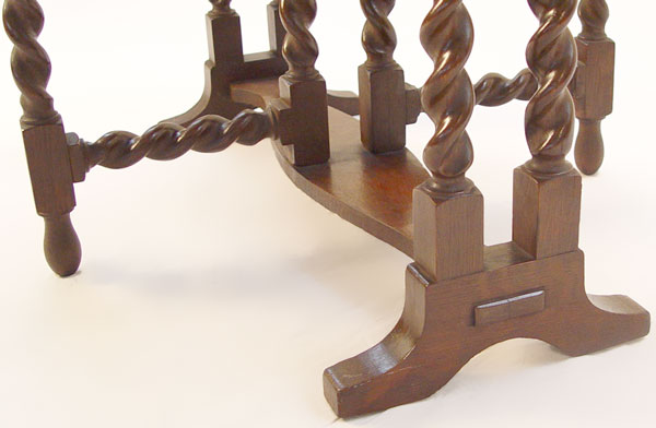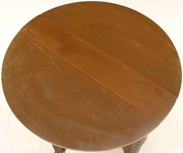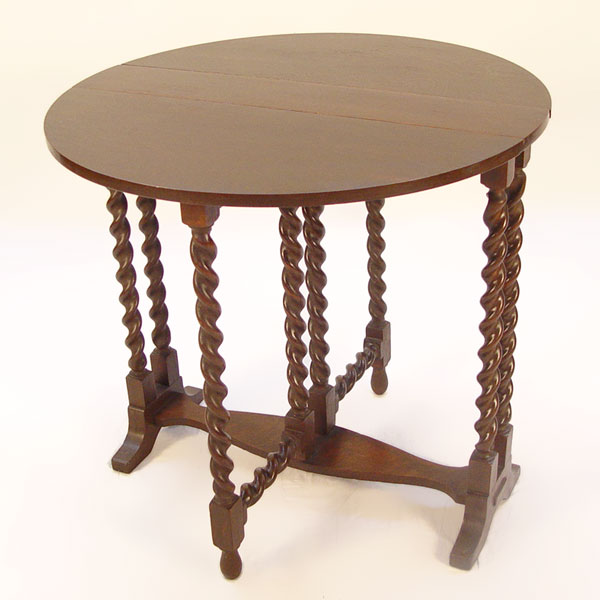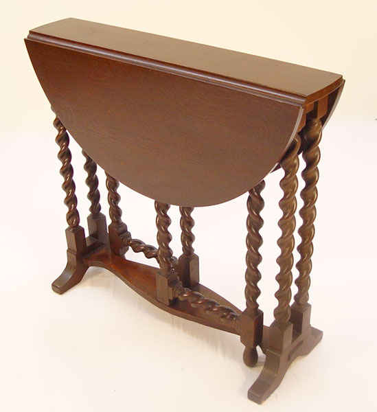 LIFETIME ARTS & CRAFTS BARLEY TWIST DROP LEAF SIDE TABLE: Diminutive drop leaf table opens to 30'' round top. Barley twist swing legs. With leaves down the table is only 7'' wide, 28 1/4''h. Paper label.
